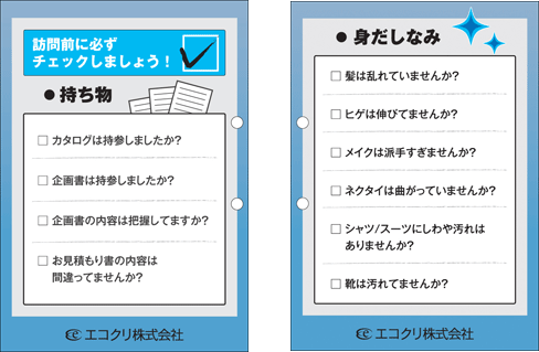 顧客あるいは営業先への訪問の前にチェックしなければならないことをエコクリスタルでマニュアルとして作成すれば、均質かつ高品質な顧客対応が行えます。訪問前に身だしなみ、販売資料、見積書の有無等をチェックシートととしてまとめておけば、対応の忘れもなくすことができ、質の高い折衝が行えます。