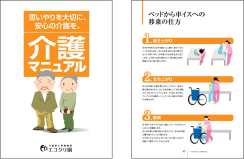 入所者への対応の仕方、ベッドから車イスへの移乗のしかたから入浴時のケアまでエコクリスタルでマニュアルを作成。すぐ閲覧できる状態にしておくと、心の通うサービスの向上が図れます。