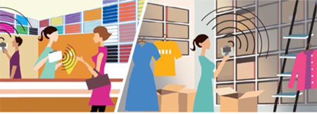 「オススメ商品探索システム」はオススメの商品を探しにショップを訪問した際に、スタッフがRFIDハンドリーダーにより目的の商品まで誘導するソリューションです。
