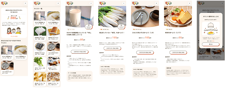 クエストにはそれぞれ、食生活データの登録といった達成条件が設定されており、達成時には、クエストごとに設定されたポイント(ユニバースで利用できるRARAポイントに交換可能)が付与されます。
