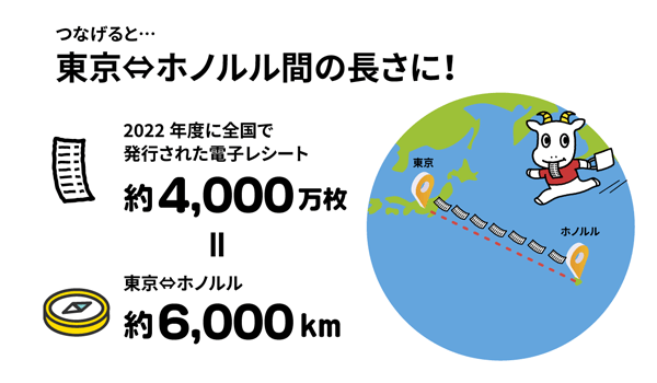 2022年度に「スマートレシート®」で発行された電子レシートの枚数は約4,000万枚。この枚数に紙レシート1枚平均の長さ(15センチ)を掛け合わせると全長6,000キロとなります。これは東京とホノルルを結ぶ長さに相当します。