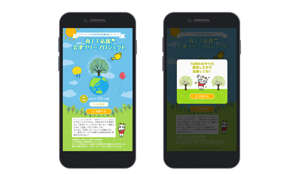福島県会津若松市内のセブン‐イレブン店舗にて「スマートレシート®」を利用してお買い物をすると、削減した1レシートにつき1口を獲得できます。獲得した口数分「スマートレシート®」アプリ内キャンペーンページ内に表示される「会津ツリー」に水やりをすることでツリーが育ち、10回の水やりでツリーの成長を達成するごとに1回、「応援」ボタンを押すことができる仕組みです。