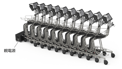 また、これまでの「ピピットセルフ(カートタイプ)」では、搭載しているバッテリーをカートから取り出して充電をしていましたが、今回発売する新型の「ピピットセルフ(カートタイプ)」では、専用の親電源に先頭のカートを接続し、その後ろにカートを連結させていくことでバッテリーをまとめて充電することが可能で、店舗オペレーションの効率化に寄与します。